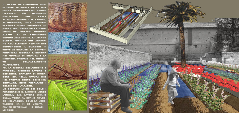 | Il senso dell’”Hortus conclusus” si rivela nella sua intima trascendenza, giusto l’angolo più profondo dell’animo che anela all’alito divino. Dal lavoro, all’orazione, alla contemplazione tutto protende al divino per mezzo della meraviglia del creato: “Sobhan Allah”. E’ un sentimento comune agli uomini. E’ usando questa formula che arriviamo agli elementi “divini” che compongono il giardino in tutte le culture.