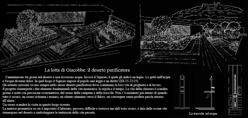 La matrice geometrica su cui è impostato il labirinto, percorso difficile e tortuoso ma dall’esito sicuro, è data dalle rovine che riemergono nel deserto, simbolo delle tentazioni della vita passata.