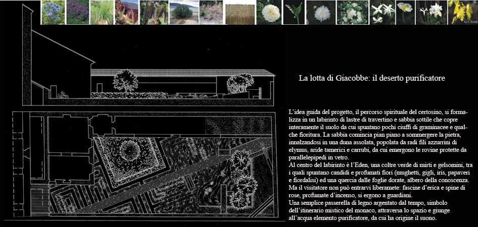 | L’idea guida del progetto, il percorso spirituale del certosino, si formalizza in un labirinto di lastre di travertino e sabbia sottile che copre interamente il suolo da cui spuntano pochi ciuffi di graminacee e qualche fioritura. La sabbia comincia pian piano a sommergere la pietra, innalzandosi in una duna assolata, popolata da radi fili azzurrini di elymus, aride tamerici e carrubi, da cui emergono le rovine protette da parallelepipedi in vetro.