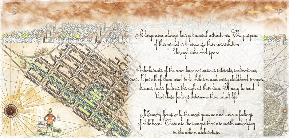 to organize their interrelation through time and space. Inhabitants of the area have got various interests, inclinations, taste. But all of them used to be children and carry childhood images, dreams, fears, feelings throughout their lives. It may be said that these feelings determine their adult life. Memory keeps only the most genuine and unique feelings of childhood. These are the images that are worth embodying in the urban architecture. | |||||