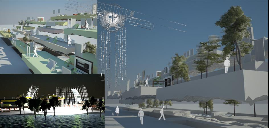 | Architecturally unconcrete complex arised on cross-road is presented as CBD zone of EveryVille, which also have deep historical leaders. Itself deepen square subconsciouslly feels influence of traditional Chorsu Bazaar, which in Tbilisi differently from central Asia was developed around the crossing streets. where trade zones were around closed square. Structures throw up in heaven are commercial and office spaces dictated by the Hanging Gardens of Babylon. Arised from archaeological layer, memory as came out like a volcano from ground depth and still actual theme. this will be erased in the future as it happened at the boundary of millennium, depended on different civilization. it will move to memory depth until become temporarily legalized space-time life conditions. These two clearly differented examples in our application has its own reason because city is a social memory with cultural one. We grouped these memories together accordance to a contemporary city’s demand. |