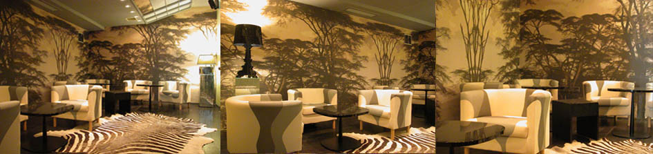Dal salone principale si accede alla saletta lounge (accessibile sia dal ristorante che dall’area cocktail oltre che dalla Hall dell’Hotel Cavour) dove predomina l’immagine di una savana che restituisce una profondità al piccolo ambiente abbinata a delle poltrone mimetiche personalizzate dall’architetto ed un tappeto in cavallino. |