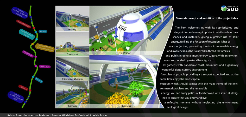| The Park welcomes us with its sophisticated and elegant dome showing important details such as their shapes and materials, giving a greater use of solar energy, fulfling the function of reception. It has as main objective, promoting tourism in renewable energy and awareness, as the Solar Park a thread for families, and public in general meet energy culture. With an environment surrounded by natural beauty, such as: gardens with panoramic coast, mountains and a generally wonderful along nursery environment funiculars approach, providing a transport expedited and at the same time enjoy the landscape; a museum which should consist with the main theme of the environmental problem, and the renewable energy; you can enjoy patios of food cooked with solar; all designed to ensure that you enjoy and live a reflective moment without neglecting the environment, ecological design. | |||||