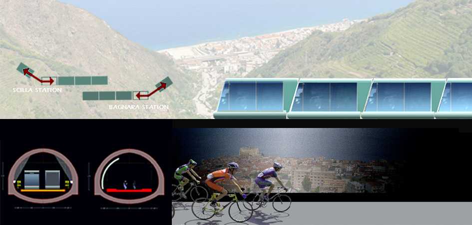 The bike path’s tunnels are proposed to be equipped with motion activated LCD-screens on the walls facing the coastline. A live view of the exterior environment will be transmitted by video cameras located along the hill slopes. Electrical energy will be generated by parabolic solar mirrors, which also are intended to symbolize the highway as a cutting edge technology project. The roadsides are proposed to be landscaped, both for environment and as a safety barrier. The cost of implementing phase one is minimal with the exception of tunnel LCD screens. The light rail line, proposed as a second phase, would be powered by electricity generated by solar panels on canopies at stations (with supplementary windmills reminiscent of a row of Greek columns). The train is designed as detachable modules, which can function as independent electrical cars. The relatively even level highway lends itself to a cost-effective rail track solution.