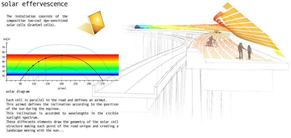 Throughout the year in constant rhythm the “Calabrian sun” strikes the flat and narrow asphalt surface in the coastal landscape; just like waves and currents that never cease to transform the coast. Our proposal aims to harvest the energy that is created in the interaction between the geometry of the highway and sun-rays hitting it at different angles throughout the seasons. A canopy of dye-sensitized solar cells (graetzel cells) follows the geometry of the decommissioned highway. This low-cost technology is extremely promising and is considered to be a potentially significant contributor to renewable electricity generation by 2020. Each panel is tilted at the exact angle to capture the specific wavelength of light predominant at its position. As the road changes direction the panels change inclination and color, always achieving optimal efficiency. Production of electricity forms a new landscape of light and color to mature, evolve and to be enjoyed. |