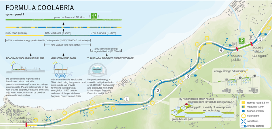 | Since its inauguration 40 years ago, the highway A3 between Bagnara Calabra and Scilla, as part of the European network of highways, has had almost no contact with the local community. Now the time has come that the decommissioned highway will finally serve the local community by turning it into a power park - bringing the existing land-art structure to a higher level. Using the given conditions of streets, viaducts, and tunnels for an interlocking system of green energy production, it will serve the inhabitants of about 20.000 people. Next to producing power for the inhabitants of Scilla, Bagnara and Favazzina, it will also serve as a an outpost testing ground for the cutting edge “Istituto Donegani” and an experience trail for all ages, bringing the latest Italian technology to the public. The energy system takes advantage of 3 different conditions of the highway structure (street /viaduct /tunnel) for a compatible renewable energy use, becoming a network of power production. | |||||